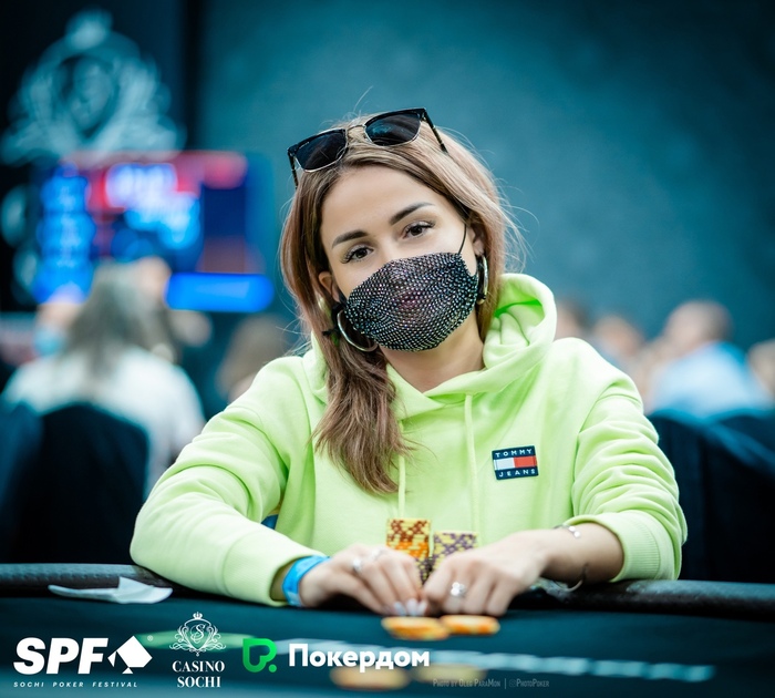 Лидия Беляева открылась с баттона, Максим Секретарев ответил 3-бетом с большого блайнда. Лидия поставила 4-бет олл-ин с , но у Максима были .
