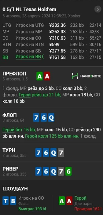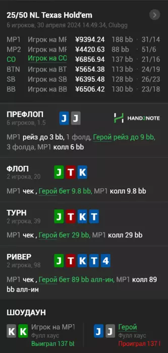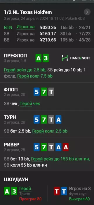 Это просто пиздец без комментариев , позавчера была сыграна конец сессии , хобби с 3 бетом 2 я нажал показать карты выжал таймбанк так как знал что там только АА и сидел просто собирался выкинуть в открытую и швырнуть ему карты , в итоге под конец второго таймбанка в голову щелкает а вдруг не тузы и я нажимаю кол , пиздец я не могу обьяснить это чувство кем ты себя ощущаешь в этот момент
