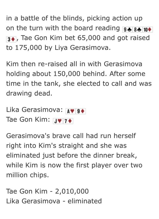 В один момент где-то в трех столах на J36hh доске было у меня А3hh. Поставила чуть больше трети, двое пас, бб колл. Терн 7о, чек чек. По риверу флеш не закрылся, но пришел король. На чек поставила практически под олын оппа, понимая, что я почти всегда буду тут младше. И пока он думал 2 минуты, у меня было такое дикое напряжение, что весь зал заиграл яркими размытыми краскими. И когда бб сказал "Ace king good" и выкинул, ощутила, что именно такие раздачи сжирают энергию и приводят к усталости. То есть вот сидела полтора дня и еще до этого в Вегасе пару дней, между ними несколько перелетов, а усталость навалилась только в этот момент.