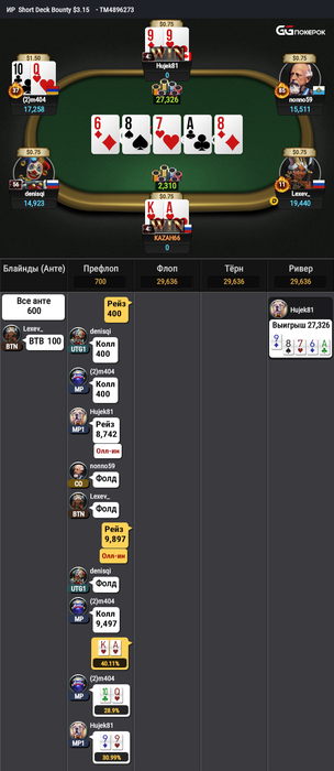 DedoKK, доехать в хорошие призы, попадая через микролимиты, все равно нереально: там превосходство в фишках тех, кто играет крупно, просто непомерное. А так, я попадал в минимальные призы, имея 1 вход в турнир с пло5, и не попадал в призы, имея 5 входов (имеется в виду, стек состоял из суммы фишек за 5 переездов). Еще не совсем понятно, как определяется сакаут, кулер и т.п. Неоднократно не получал никаких входов, влетая сет в сет на флопе в 3бетпоте.