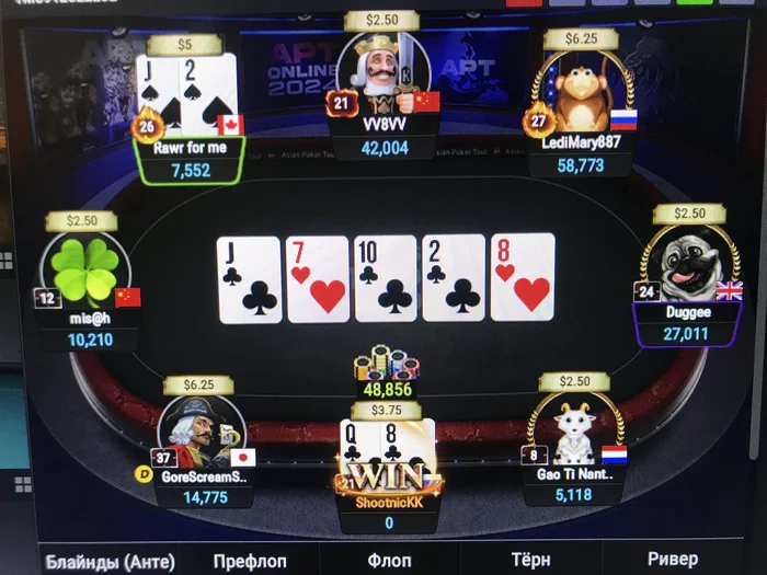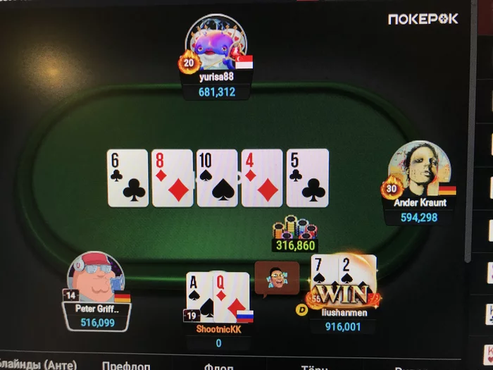 Ну и последняя раздача последнего турнира дня в топ-6. Охуенно.