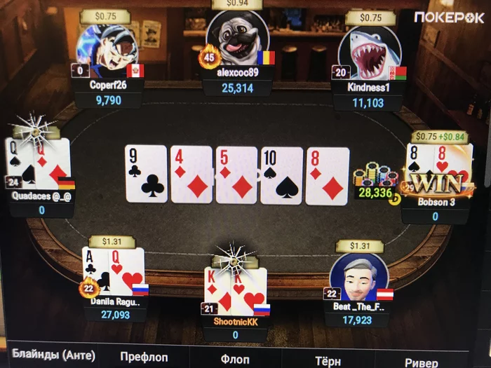Я рейз префлоп-кол. Бет флоп - кол. Тёрн донк пуш. Ну, я пожав плечами, жму кол и тут на экране начинает крутится колёсико загрузки и клиент повисает.