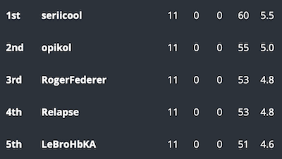Призовые очки в лидерборд: 1 место — 12,5 очков - seriicool 2 место — 9 очков - opikol 3 место — 7,5 очков - RogerFederer 4 место — 6 очков - Relapse 5 место — 5 очков - LeBroHbKA
