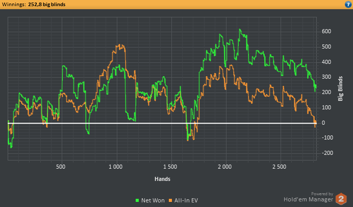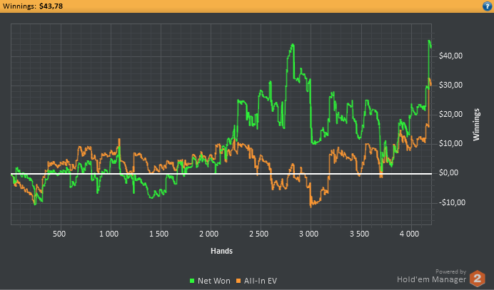 Ну убери все ситуации где ты отдался сам фишам как минимум около нуля будет график,это ненормально на тысячи рук такой график иметь. Автор отдается вторым третьим натцем и удивляется как это так ,а что омаха игра натцев он забыл про терпеть и ждать хороших рук это вообще не про него)Говорит во бразильцы опять сет с флопа флопнули и отдается 2мя парами или на флеш Дро,ну так ты выжди когда сам попадешь,а то хочет чтобы всегда омаха игра терпения также а как ты срываются и вот такие графики ненормальные на тысячи рук