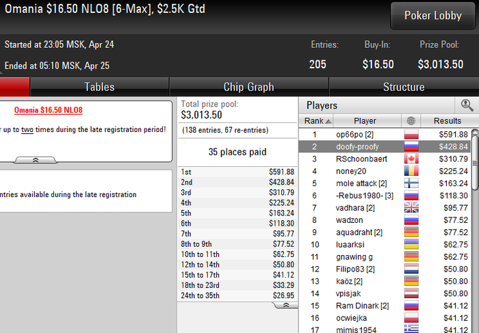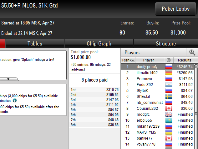 Была финалка за 5.50 в ребайнике еще, но я там занял место 6-7, поэтому не скринил. Сегодня день недоездов. Было пару очень хороших проходов. И в комании, проиграл монетку за хороший стек и в омании за 82 я на бабле ссыграл неправильно руку и вылетел)) Будем работать. Всем гл и спокойной ночи