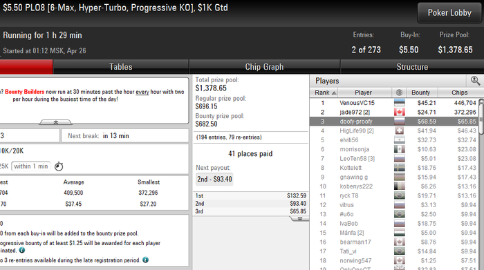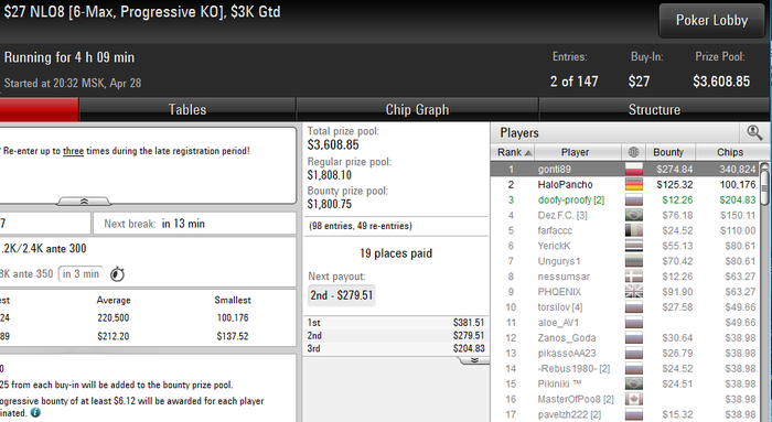 _Lucky_, Бывало и без кноков люди на финалку выходили)) Тут еще сказался второй вход. Я его сделал вроде как при 30 бб или около того. А в этом турнире шортов мало в таком промежутке времени. Так что сойдет.