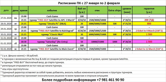 Дорогие друзья! Представляем Вам расписание покерного клуба с 27 января по 2 февраля. Обратите Внимание, что на этой неделе турниры Satellite пройдут в формате FREE-BUY (бесплатный вход на старта турнира).