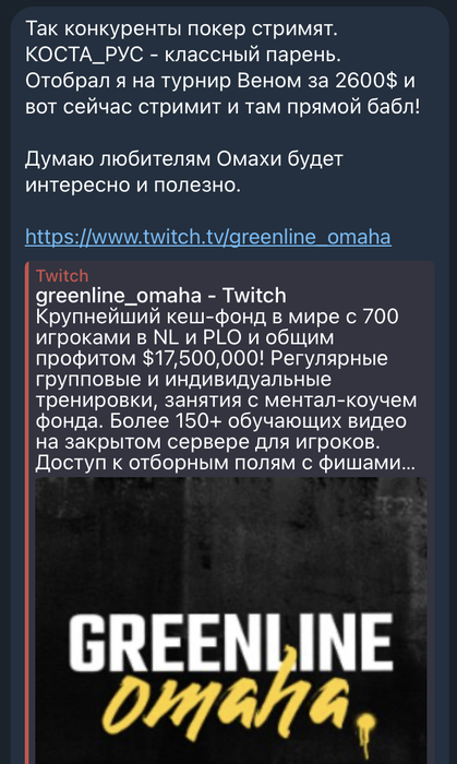 он не должен писать у вас на каналах, на твиче и нигде! С ним не должны общаться сотрудники ГРИН ЛАЙН! по крайней мере на рабочие темы! Он еще глумится над вами в ТГ -)))) Конкуренты-)))))