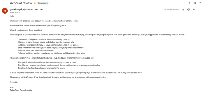 Пам-пам-пам-пам 🙃 Всё-таки Kalapoju со своими друзьями наныли проверку аккаунта. Скоро попросят записать видео и потом пару недель, или месяцев, придётся гриндить без Старзов, пока идёт проверка 😐