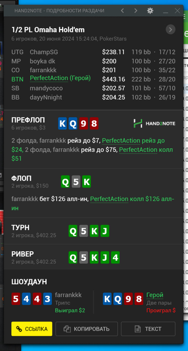 Недавно произошло то самое принятие диспы в омахе после встречи с еще одним таким же везунчиком и длительного разговора обо всем ) Саня привет ! Стало как-то спокойно и одновременно все равно на результат, цель одна - как можно больше правильных решений и как можно больше отыгранных рук. Винрейтами меряться можно в апсвинге, но в большинстве своем все это фикция, потому что мерять результат даже по ЕВ без миллионов отыгранных раздач бессмысленно, можно только наблюдать тенденцию. Можно прилично сократить диспу играя коротким стеком и об этом я задумаюсь пройдя путь чуть выше.