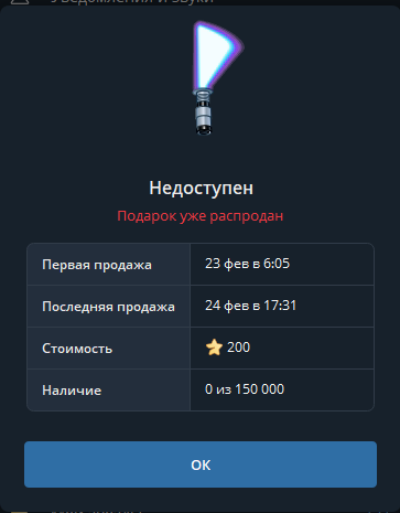 На счёт того когда был пресейл. Ты заходишь в телеграм с телефона или пк. Нажимаешь отправить подарок. Выбираешь "редкие" и там отображаются все модели подарков и даты когда они были выпущены и когда торги закончились. Конкретно лазерные мечи телеграм выпустил 23 февраля в 06:05 и 150,000 экземпляров раскупили 24 февраляв 17:31. Потребовалось больше 24 часов. Для сравнения некоторые модели подарков выкупают за 5-10 минут после анонса. Некоторые напротив выкупают долго, неделями. Обычно чем быстрее скупают подарок, тем он по итогу ценнее будет)