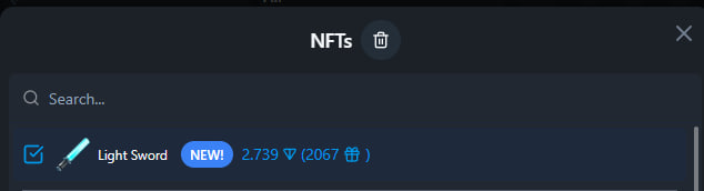 Сейчас речь пойдёт про NFT подарки лазерных мечей. У меня их было куплено 1,500 штук на $4,500 по $3 за штуку. Помимо лазерных мечей у меня ещё 9 гладиаторских шлемов по 75$ за штуку, 31 золотая бицуха по 150$ за штуку и 15 кирпичей по 75$ за штуку. Но из всех вышеуказанных подарков можно выставить на перепродажу пока только лазерные мечи.