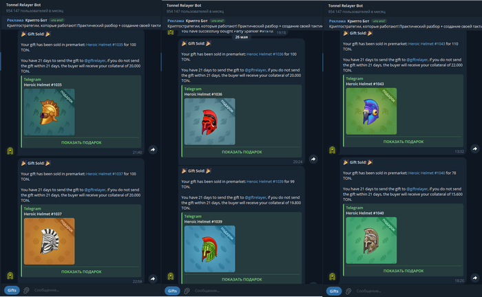 Первый шлем продал 30 минут назад за 110 TON ($330).