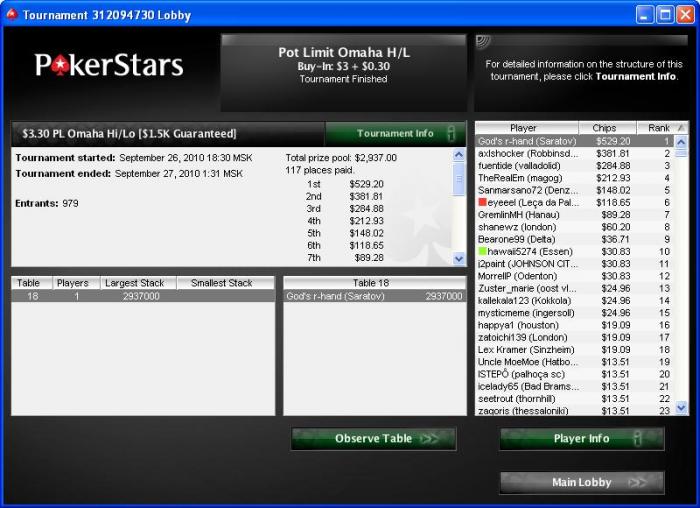Решил сегодня сыграть Омаху Х/Л. Надо сказать были раздачи, где очень складывалось, но реально почти не переезжал. Но 1 раз так переехал, что аж самому стыдно стало В Топ-18 был гигантским чипаком и уже можно сказать был мыслями на финалке. Но дальше по закону подлости 2му стеку в 3бет поте терном закрылся гатшот на колесо и на финалке пришлось очень тяжело. Даже уже в ХА был адский куллер после которого был готов забить на первое но собрался и затащил!