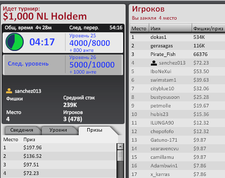 По турниру ,где занял третье место.Тоже шло гладко,правда стек был неже среднего на предфиналке,на финалку вышел шортом и здесь тоже не обошлось без лака.Удавалось воровать,когда заходил удачно попадал в флоп.Когда остались троём, у меня 230К,у чипака 1,3К!!!,у шорта 130К...Я уже расчитывал на уверенное 2 место,но в раздаче с шортом попал с топ парой в сет и итог был предрешен!