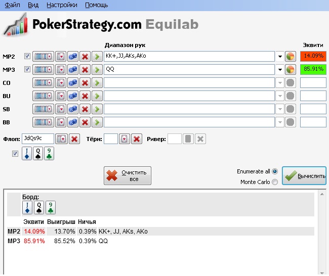 Рег не заколит, так как стат нет, поставил такой спектр, не думаю, что он за3бетит 99 и К10s, итого выходит 86% даже если опп не 3бетит АК и JJ, то у эквити у нас уменьшается на 1%, можно конечно поиграться и поставить там побольше всего, но это не изменит ничего по сути, а то, что рука уязвима, так это больше не оправдание похоже, любая рука на флопе уязвима, по-моему очень плохо сыграно, жуткий недобор на дистанции