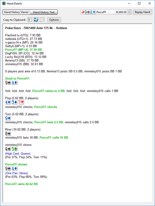 Для колла надо 40% побед. На терне я ему не ложил никаких натсов, а на ривере его ставка выглядит как очень очень полярная. Либо там ничего (либо говно превращенное в блеф), либо офигенный доезд.