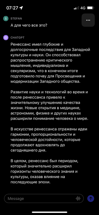 Простите что так долго. Слишком много событий происходит одновременно. Иннер я поднимаю ставки! Точнее я ставлю на карту все что в моей душе. Зачем нам медлить? Пора заканчивать с онлайн звонками. Оставим это петушкам. Ковид закончился. Нужно открывать новые границы. Новые земли! Я могу и хочу помочь с этим всем кому интересно развитие и жизнь с восприятием без каких-либо выдуманных и заученных границ. Я здесь в Аргентине с революционным 3D архитектором. Сущность которой можно выразить как среднее между господином Маском и гением непоколебимого Говарда Рорка. Человек видит структуру реальности по-другому! Полностью. Разумеется он видит 4D структуру. Но речь о другом. У него гениальное видение как творить вершину инженерной мысли в этой самой структуре. Только две парадигмы конструирования реальности. Только суть. Функциональная инженерия и эстетика. Прямо сейчас мы создаем Буэнос-Айрес в 3D. Через 3 месяца будет готово. Прямо сейчас устанавливаются связи и взаимопонимание с ключевыми фигурами в стране. Все организуется само собой потому что люди видят суть нашей организации и начинают постепенно понимать что происходящее выгодно абсолютно всем людям. Составные точки сводятся естественным образом в единую лаконичную картину. Никаких преград не осталось. В начале следующего года выходят виртуальные очки эпл. Понимаешь что это значит? Это как выход первого айфона после кирпичей нокиа. Возможности безграничны. Наши люди уже занимаются разработками. Ты важная функция во всем этом. Перебирайся в Аргентину с семьей. Мы поможем с подбором недвижимости, организацией пространства и облегчением процедур получения гражданства. У тебя будут ключи от моего хаба. Бессрочно. Наш хаб расширяется, мы скупаем земли. Следующим этапом будет моделирование новых городов на этих землях. Сразу же не тратя энергию на суету мы застроим эти земли и заселим талантливыми людьми. Уже разрабатываются гениальные архитектурные решения. Вершина инженерной мысли в градостроении. Это будет интереснее чем проект Неом в Саудовской Аравии. Через 3-5 лет Аргентина будет одной большой Кремниевой долиной. Только гораздо лучше. Это будет оптимально разработанная Кремниевая долина для всех кому интересна большая игра. Здесь люди давно мечтают об этом. Пол тысячелетия нейроны на этом континенте проходили коллективное обучение и организацию. Всё кристально ясно. Экспансия началась с мечтателей из разных уголков Европы, в особенности Испании, Франции, Италии, Германии. Самые смелые и любопытные люди организовались на кораблях переплывать океан. Без гугл карт! Для чего? Какая сила движет этими людьми? Они рискуют своими жизнями! Для чего? Неужели не очевидно? Их заебала пассивная и шизоидная матрица мира в которой они живут! В это время в Европе ренессанс в самом разгаре, а они бросают все и садятся на корабли!