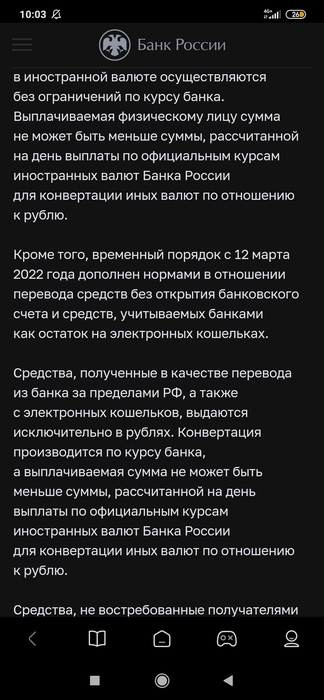 Zager, действуют ограничения по валюте, можно получить наличными только 10т долларов, которые были на счете/вкладе до 9 марта. Если сделаешь перевод валюты с банковского счета или платежной системы, получить наличные сможешь только в рублях, но тебя не заставляют конвертировать валюту.