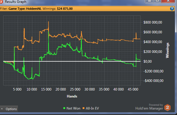laio @ 27.11.2015 Подскажите, вот такой у меня график турнирных результатов. Можно ли по расхождению Net Won и ALL-in EV сделать вывод, что часто не доезжает?