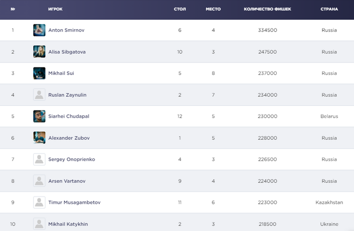 Вылетел Дмитрий Пономарев. Он проиграл ключевую Игорю Глухих: < (по 260К, SB vs BTN). Раскрутиться с пяти тысяч Дмитрий не смог.
