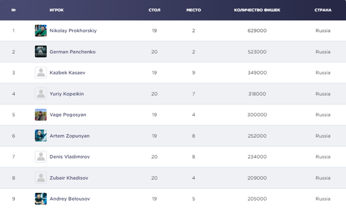 За вторым столом Николай Прохорский никому не дал развернуться во время синхронных раздач, поставив семь или восемь олл-инов. Он завершил этот флайт с первым стеком.