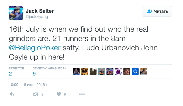 "Откровения твит" : Только 16-го июля (спустя шесть недель после начала мировой серии) мы можем убедиться кто является настоящими гриндерами. В утреннем 8-ми часовом саттелите (на кубок Белладжио по 10К) играют Урбанович и Джон Гейл.