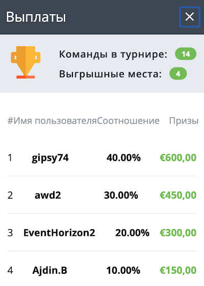 1 место — 36 очков - crashe (+1 тикет по 11 евро)