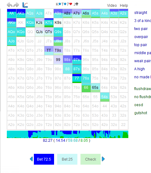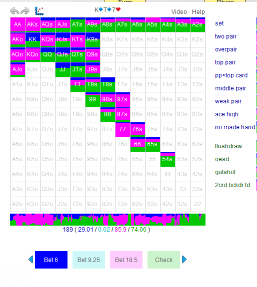 И где тут овербетить на доске КТs7J6 без закрывшегося ФД в 3БП ББвсБТН ООР!?!? Только бет 50% - бет 30% - бет 50% норм пролезут. Остальные сайзинги либо с перекосами в сторону велью, либо в блеф. Ну это я так насчитал