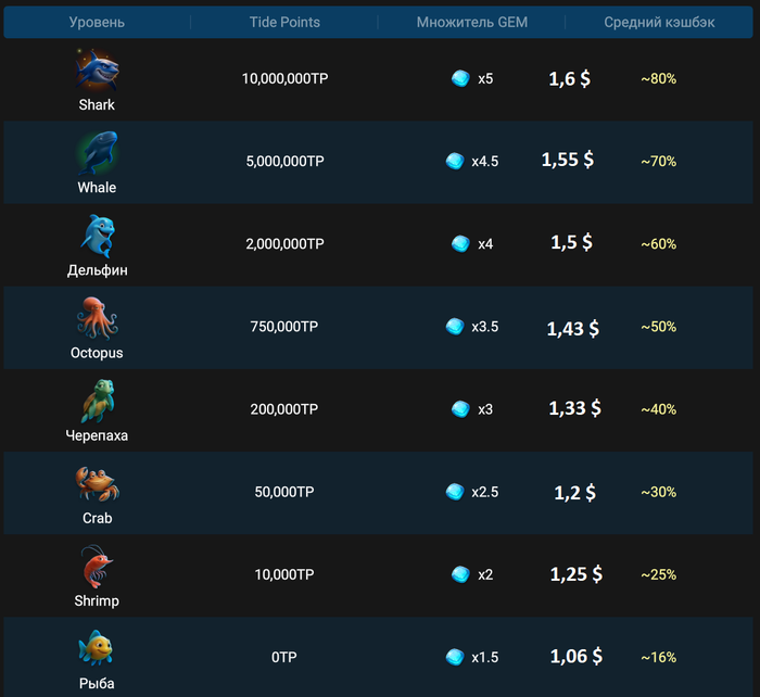 Чтобы получить реальные 70% по своему статусу, я должен менять Гемы по самому последнему курсу. Чтобы достичь 60% которые у меня были ранее, я должен менять минимум по курсу 7,5кк за 10к$. Мне почему-то не дали макс статус по новой системе, а только Whale.