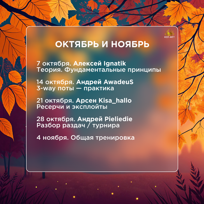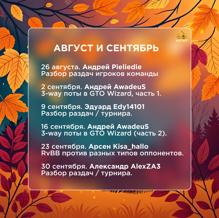 ➡️ Андрей AwadeuS — старший тренер школы КОТ-МТТ. Опытный игрок с огромной теоретической базой, постоянный участник серий оффлайн. Умеет просто и понятно объяснить даже самые сложные темы.