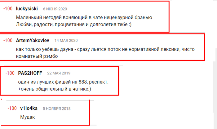 Каждое из этих животных меня оскорбило, либо пыталось задеть, либо оставило негативный отзыв в моём профиле, но из-за лицемерия гнилого модератора, который пытается спровоцировать и выжить меня с форума - я не могу им ответить и больше никому не могу оставлять отзывы. Несмотря на то, что никаких правил или договорённостей я не нарушал. Поэтому те, кто считает, что это несправедливо оставят данным господам негативные отзывы вместо меня. Не оставят - ну окей, значит не повезло, shit happens