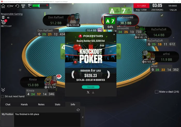 Оставался последний стол, в итоге финалка, подотмазал сессию по итогу сегодня -32$. БР 9001$