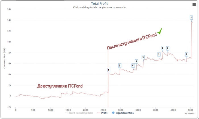 Полгода назад. У меня уже был опыт работы с фондом, затем на какое-то время ушел в самостоятельное плаванье, и вот снова принял решение вступить в фонд и отправил заявку в ITC. С моей базой в ITCJunior взяли на ABI $1,5. Мог бы подняться быстрее, так как был опыт турнирного игрока и работы в фонде. Но подъем затянулся. Когда дошел до пятого лимита, поймал жестокий стрик. Улетел в минут $1000. На графике его видно - просадка больше чем на 1к турниров. Больше двух месяцев темной полосы подавляли морально, ведь я очень эмоциональный человек. Спасибо жене, которая является моим ментал-коучем и подбадривает меня постоянно. В тот период старался катать поменьше, да и кроме покера есть основная работа, которая не позволяет много времени уделять игре. Потом всё вернулось на круги своя и дистанция всё вернула. Видно, как в последний месяц график пошел вверх.