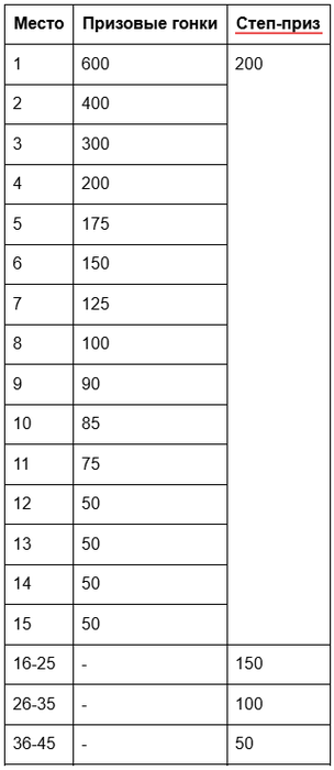 Награды от 50 до 600 получают лучшие 15 игроков. Кроме этого, 4 игрокам из топ-45 (по одному из каждой группы случайным образом) достанется степ-приз: