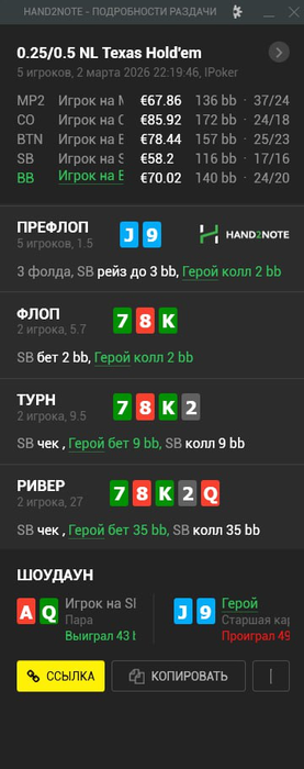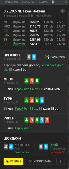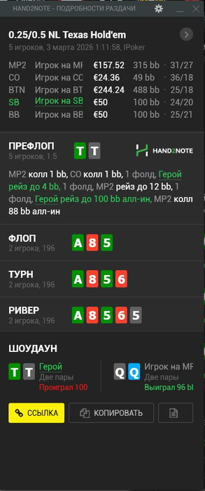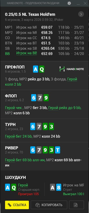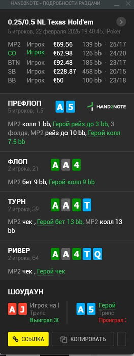 А ты уверен, что такие составы на рейке нл50 вообще могут играться в плюс? По всем раздачам максимальный ВПИП за столом 40 пару раз. При том, что есть очень много инфы, что АйПокер это прибежище ботов.