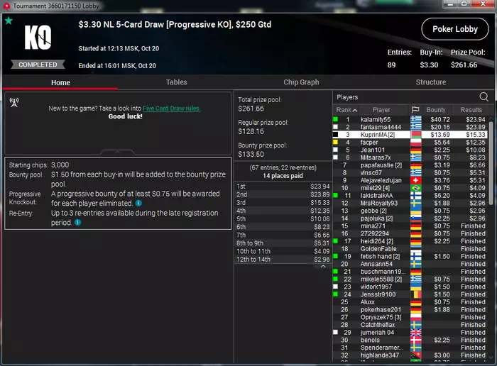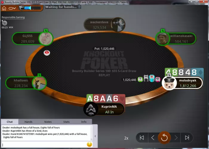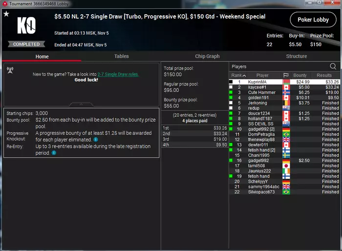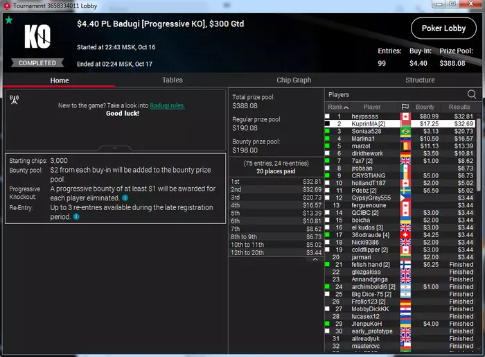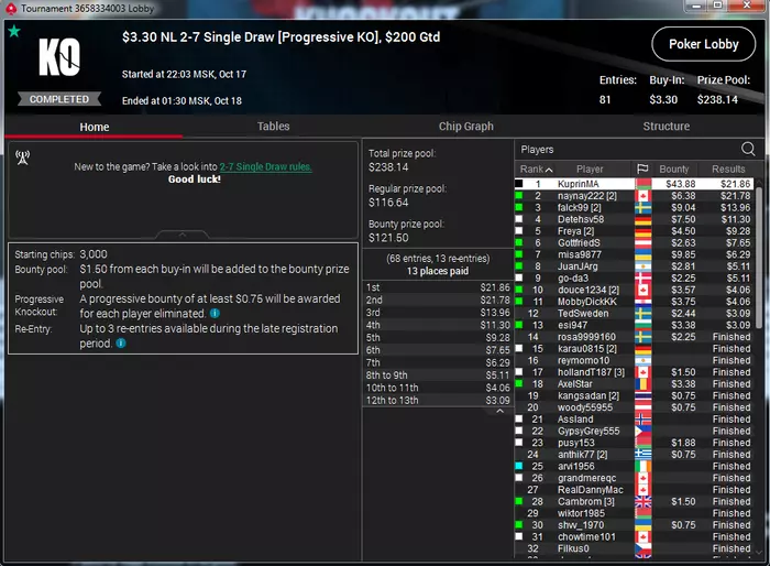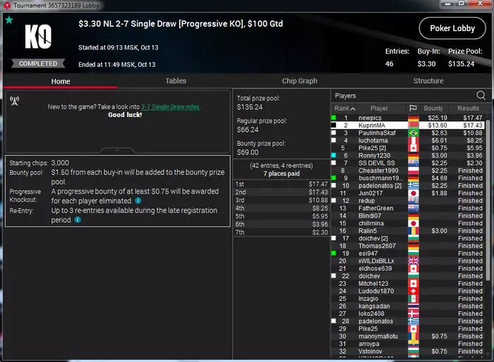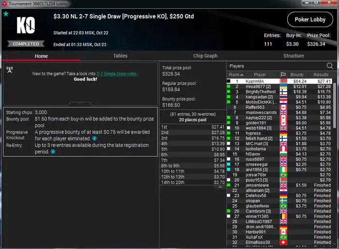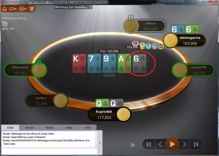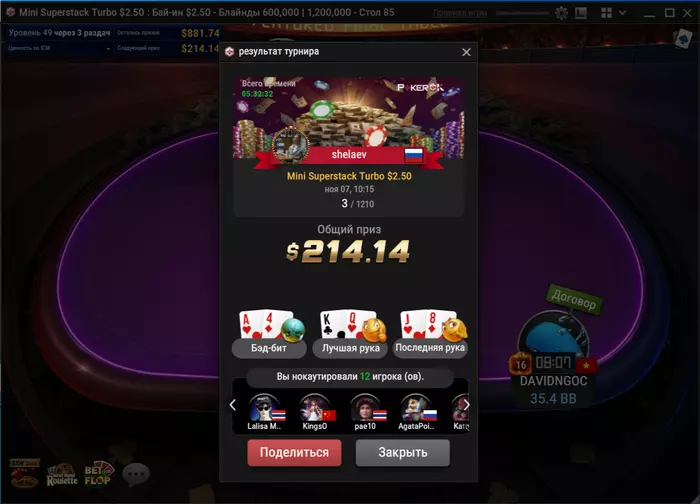 Самый неприятный недоезд. Весь турнир, в т.ч. в топ-15 был большим чиплидером, , но как часто бывает полились реки грязи и финальной стало сет тузов в две мелкие пары, которые превратились в фулл, после обмена оппом одной карты