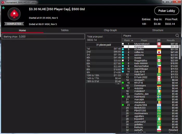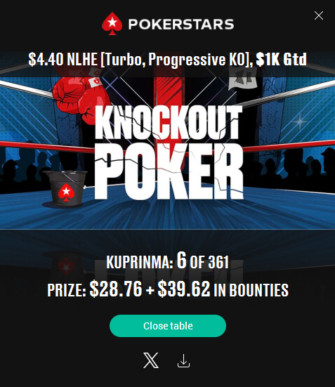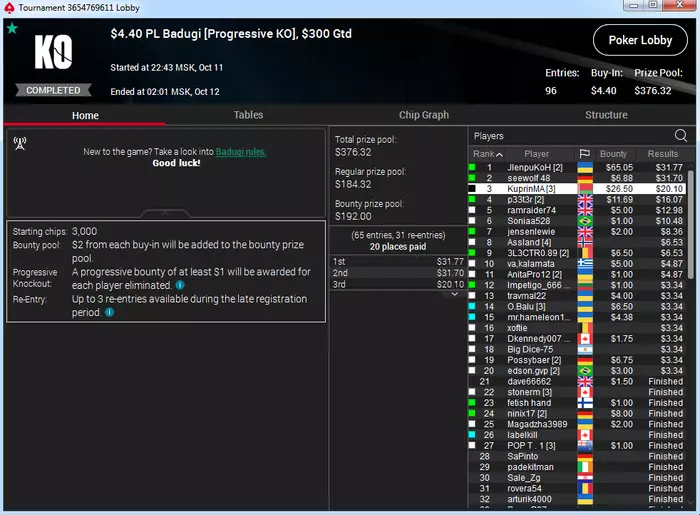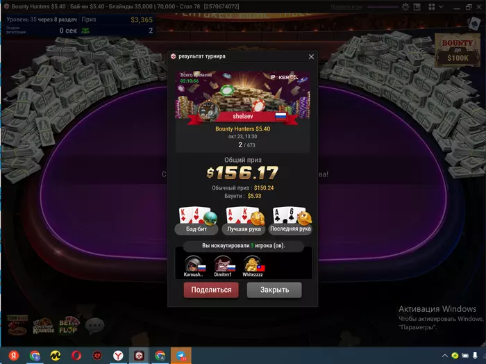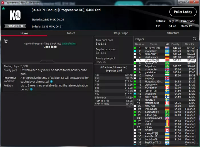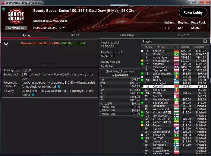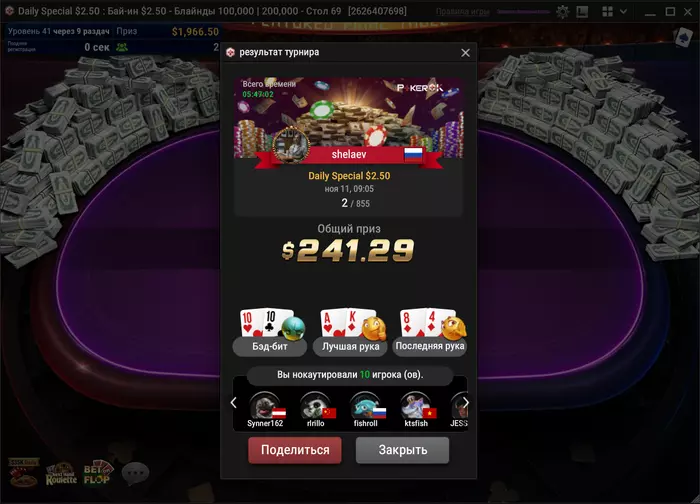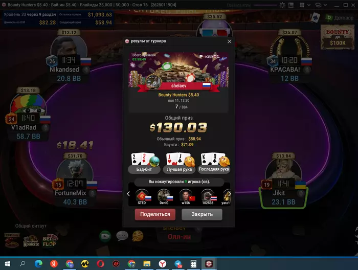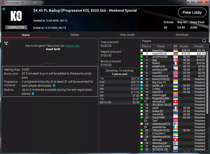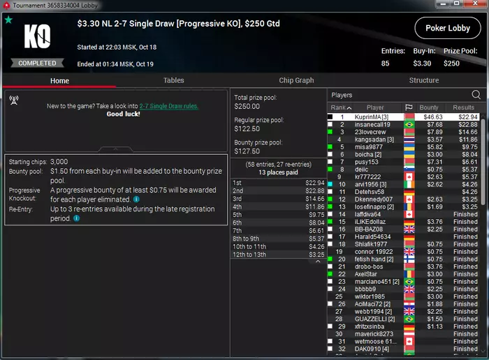 Самый неприятный недоезд. Весь турнир, в т.ч. в топ-15 был большим чиплидером, , но как часто бывает полились реки грязи и финальной стало сет тузов в две мелкие пары, которые превратились в фулл, после обмена оппом одной карты