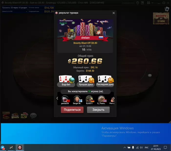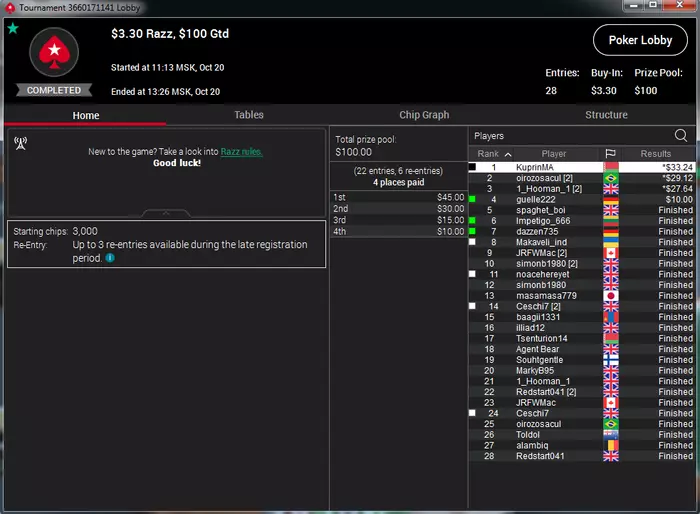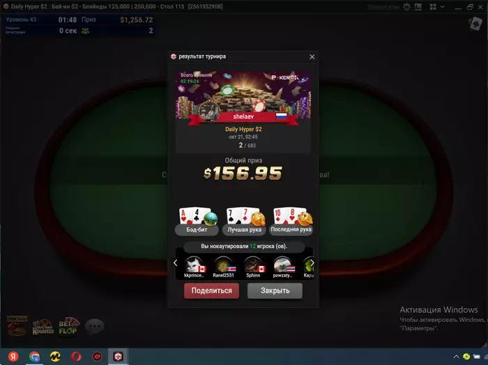 Короче, выиграл на ACR 5го числа во фрироле 20 центов. Затащил турик за 0,11. С выигранного затащил два по 1,1 и один за 0,55. БР за 4 дня стал 240 баксов. Думаю попробую выше покатать, раз уж так пошло. Ну и вот с разницей в 4 дня: