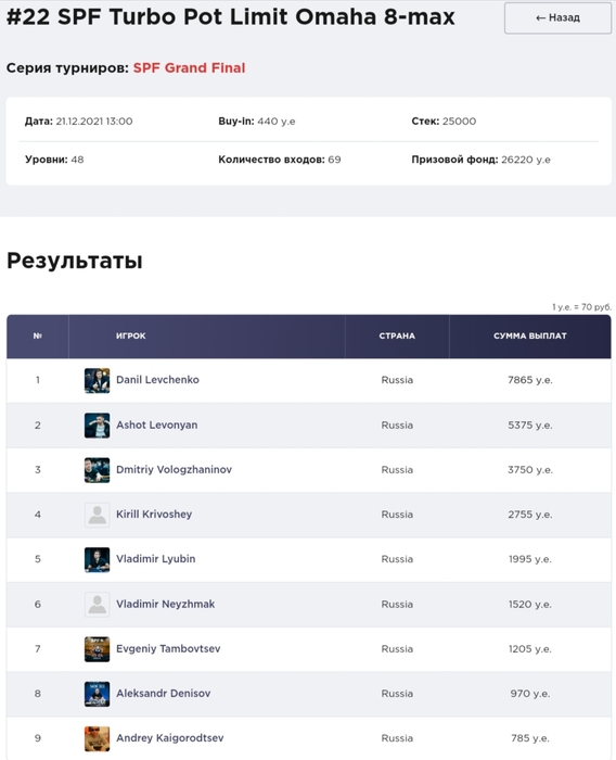 Данил Левченко выиграл омаху, обыграв хедзапе Ашота Левоняна (один на один играли около часа!). Примечательно, что они начинали сегодняшний день с Warm Up, в котором заняли 23-е и 25-е места соответственно.
