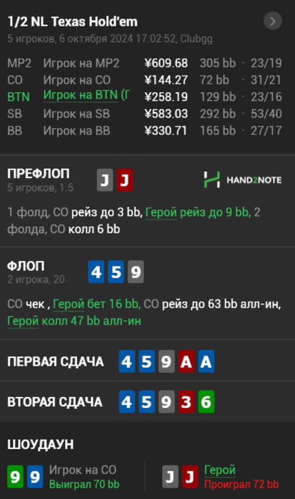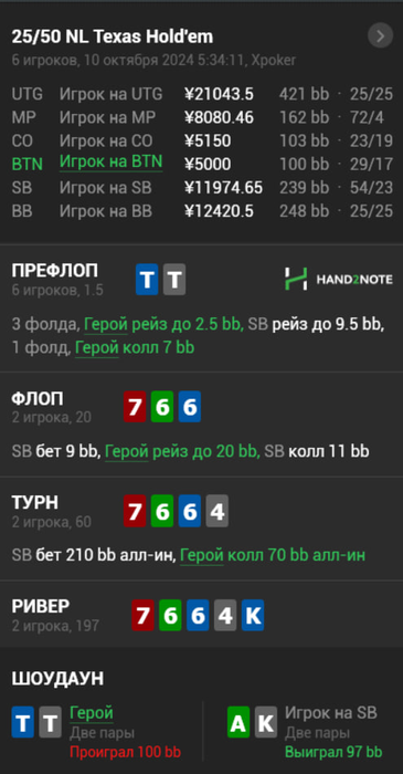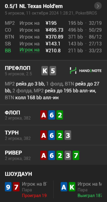 Дальше свои оставшиеся 200бб вс меня он просто так конечно не хочет отдавать и ловит топ допер с флопа, но диспа тут видимо сжалилась надо мной бедолагой