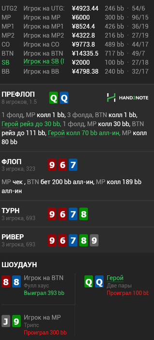 отсидел с пол 5 утра восьмичасовую сессию с випом на нл400 , играл онли 1 стол на фул концентрации , игра шла в глубоких дипах и так как любая ошибка может дорого стоить, не запускал больше другие столы , вышло примерно +1800$