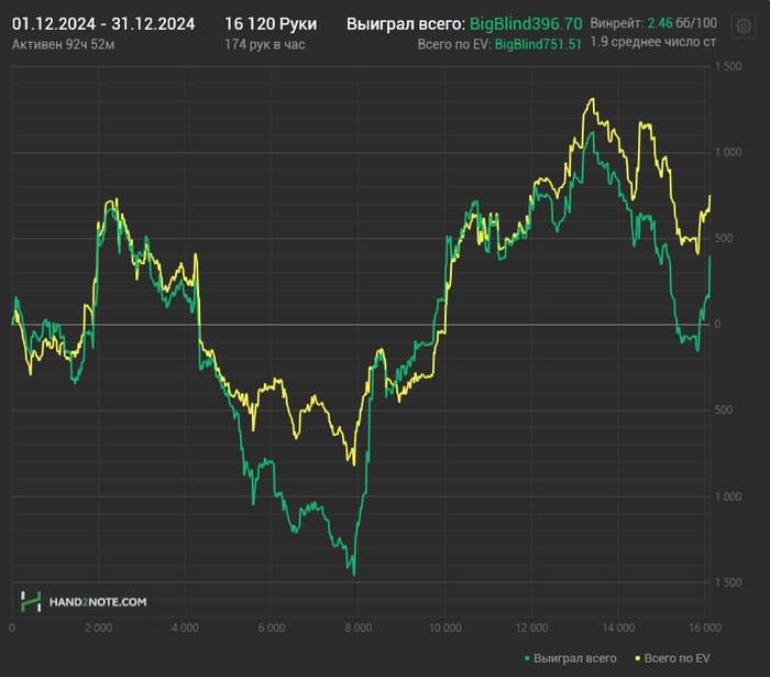 Считаю что год получился хорошим . До того момента как я решил пойти в фонд посмотрел результаты по годам 23 год общий профит был +12к и 22год +10.5к. Помимо того что улучшил результат ,достиг максимального процента отката , я считаю что немного вырос как игрок в плане технической и психологической составляющей. Начал спокойнее относиться к просадкам 20-35БИ , в течении года делал много попыток шота нл200 , но более менее закрепиться и осесть получилось только к концу года , в результате чего оформил два бестманса подряд и даже немного пощупал нл400 ( пока неудачно) .Часто очень уже случаются сессии по -1.5к$ , и я даже привыкаю вроде к этим цифрам. Считаю что все еще впереди , я не хочу останавливаться на нл200 и хотелось бы попробоваться закрепиться на нл400-600 в новом году .