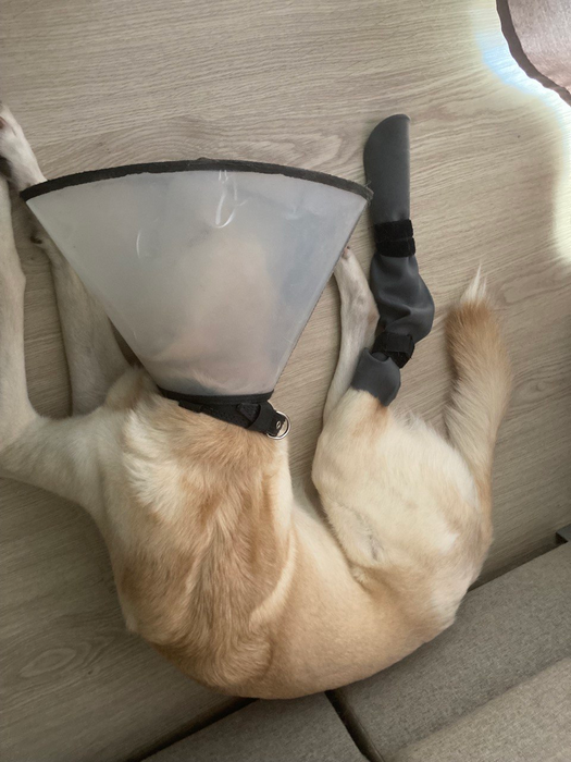 У собаки только проблемы начались, какая то болячка на ноге, которую она разлизывает постоянно. Все бинты отгрызает, купил даже специальный горький бинт, пофигу. Пришлось и колпак надеть и чулок заказать силиконовый. Если не будет заживать, поведу к ветеринару.