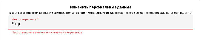 Всё бы ничего, но при вводе ФИО на кириллице : выскакивает строчка "Несоответствие в написани имени на кириллице", и дальше не пускает, чому такое?