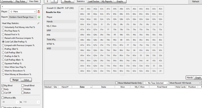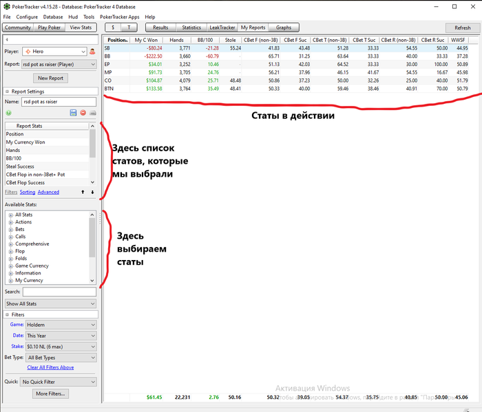 Всем привет, может, вопрос такой задавался, но, тяжело в стольких страницах найти. Нужна стата по позициям как в HoldemManager "BB Fold to BTN Steal" и "SB Fold to BTN Steal" (их в PokerTracker нет). Самое близкое по смыслу я так понимаю "Fold vs BTN Open", но эта стата скорее всего не учитывает на SB или на BB находится оппонент? Я правильно понял? Или есть возможность эти статы каким-то образом создать?