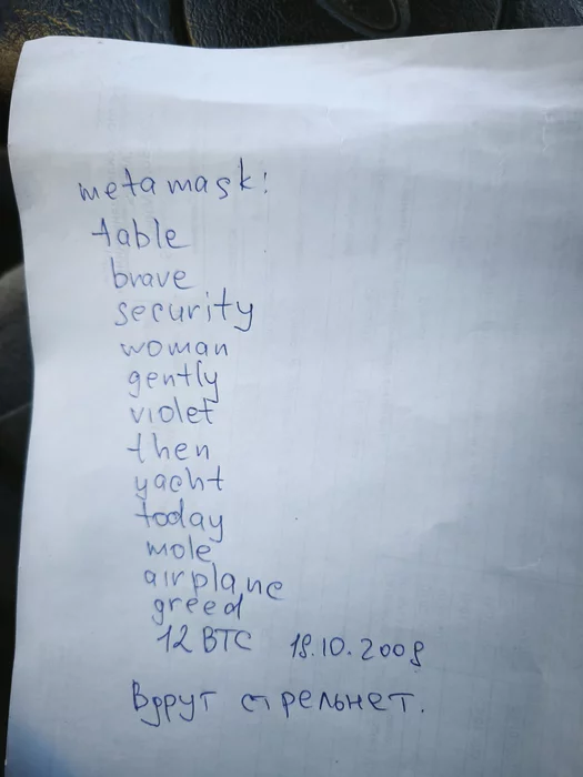 Нашёл в бардачке машины, наверное старый хозяин писал. Вот только не пойму для чего эта записка? Вдруг стрельнет что? Колесо? Херня какая-то...