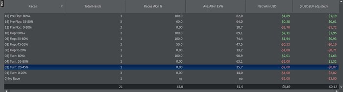35 ситуаций где у тебя на терне при уходе в аллин было от 0 до 20% эквити, посмотри эти раздачи, исключи где были реальный кулеры типа сет в сет на сухом борде и оцени, все плюсовые реги имеют средний показатель алл ин ЕВ 60%~