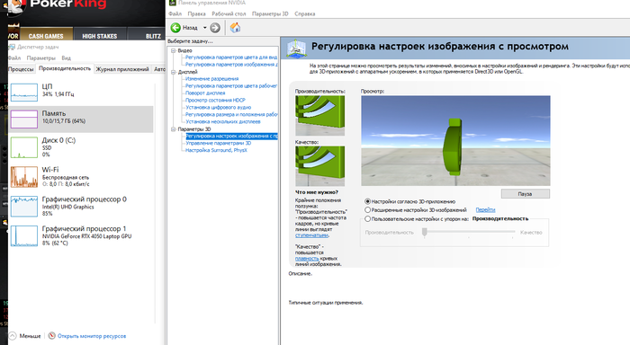 П.С. у тебя даже на скрине видно, что стоит энергосбережение (пониженные частоты процессора и использование встроенной видеокарты). Обычно там при нормальной/высокой производительности должно быть 4ГГц+