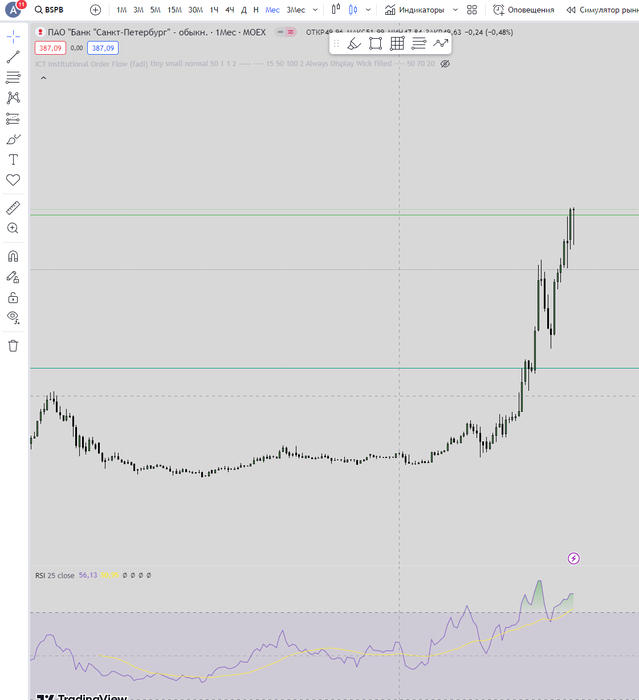 На текущий момент цена на исторических максимумах 387 р. за акцию